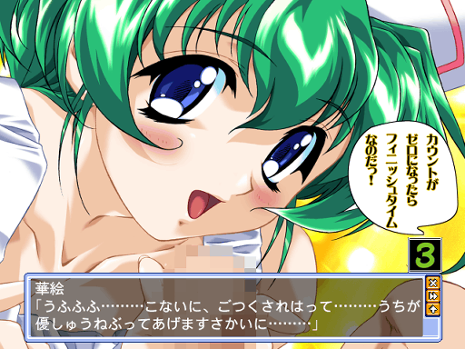 イチローシステム51では、クライマックスシーンに近付くと、画面隅に数字(大抵は10)が表示されます。そして、マウスをクリックしてメッセージを進める度にその数字が1ずつ減算されていきます。そして数字が0になった時にそのHシーンはクライマックスを迎える事になるのです。それは大抵の場合、CGに白い差分が表示されて、ひときわ甲高い、ボイスが出力される事で表現されます。